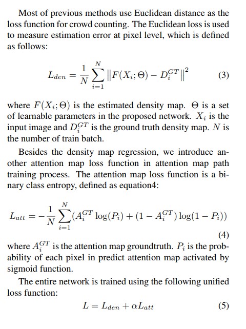 To further tackle the high background noise issue, we adopt another path of multi-scale feature fusion as attention map path (AMP) with the same structure to learn a probability map that indicates high probability head regions. Then this attention map is used to suppress non-head regions in the last feature maps of DMP, which makes DMP focus on learning the regression task only in high probability head regions. We also introduce a multi-task loss by adding a attention map loss for AMP, which improves the network performance with more explicit supervised signal.(最后一句没看懂,前面的意思是通过一个同样的网络attentionnet来识别出高概率是人头的地图,然后利用这个高概率的人头地图在网络的最后一层去掉那些没有人头的地方的干扰)