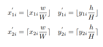 其中,(x1i; y1i)和(x2i; y2i)是第i个box的左上角和右下角的坐标值。没明白为什么要从新映射一下啊直接用坐标算不就行了吗,每懂啊。