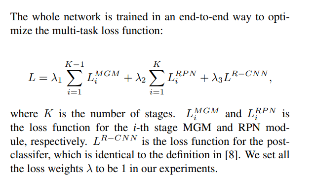 采用全卷积网络来生成掩码。它将H x W图像作为输入并生成h x w热图。为简单起见,在骨干网络的最后一个卷积层之后添加池化层以产生具有h x w分辨率的特征映射。然后我们添加两个1x1卷积层。其中一个用于提取掩码生成的特征,另一个用于生成概率图。实际上,MGM的结构与RPN几乎相同。唯一的区别是MGM了解区域是否包含目标,而RPN了解目标的位置。 因为他们的大致区域是一样的只是形式不同而已。 对于MGM,使用Softmax损失函数。由于前景和背景之间的不平衡,使用了所有正例,并随机选择一些负例,使样本比例为1:3。(没理解这里做了什么,就是什么叫随机选取了负例)。 所有示例都在可用区域中选择。这意味着如果某些区域没有被包含在先前的掩码,则在后面训练过程中会忽略它们。
