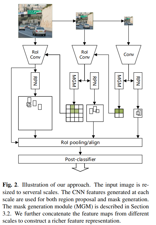 post-classifier, similar to the Faster R-CNN [9] framework. Since we use multi-scale inputs, the entire network has multiple RPNs and only one post-classifier. For each RPN, we predefine a proper anchor setting, e.g., the low-resolution RPN is expected to detect large objects but ignore small objects. After region proposal, the candidate regions extract features from the feature maps produced by the largest input and feed them into the post-classifier. As some regions are discarded by the MGM, the RPN does not propose bounding boxes outside of the positive regions.